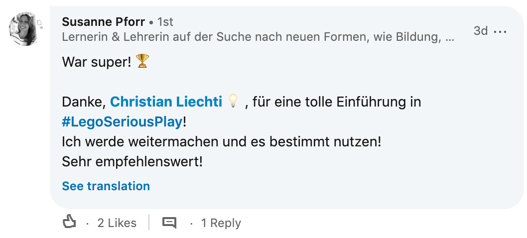- Du wirst von einem*einer der besten LEGO Serious Player Facilitator der Schweiz begleitet.